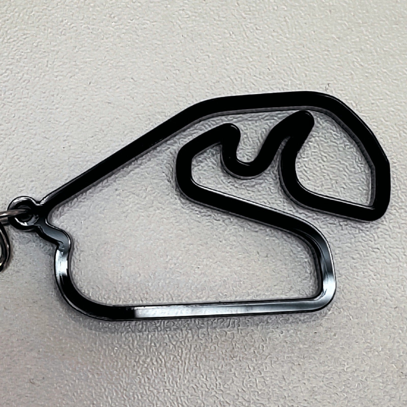 Design: Recorte preciso representando o traçado da pista, com furo para encaixe em chaveiro ou mosquetão.