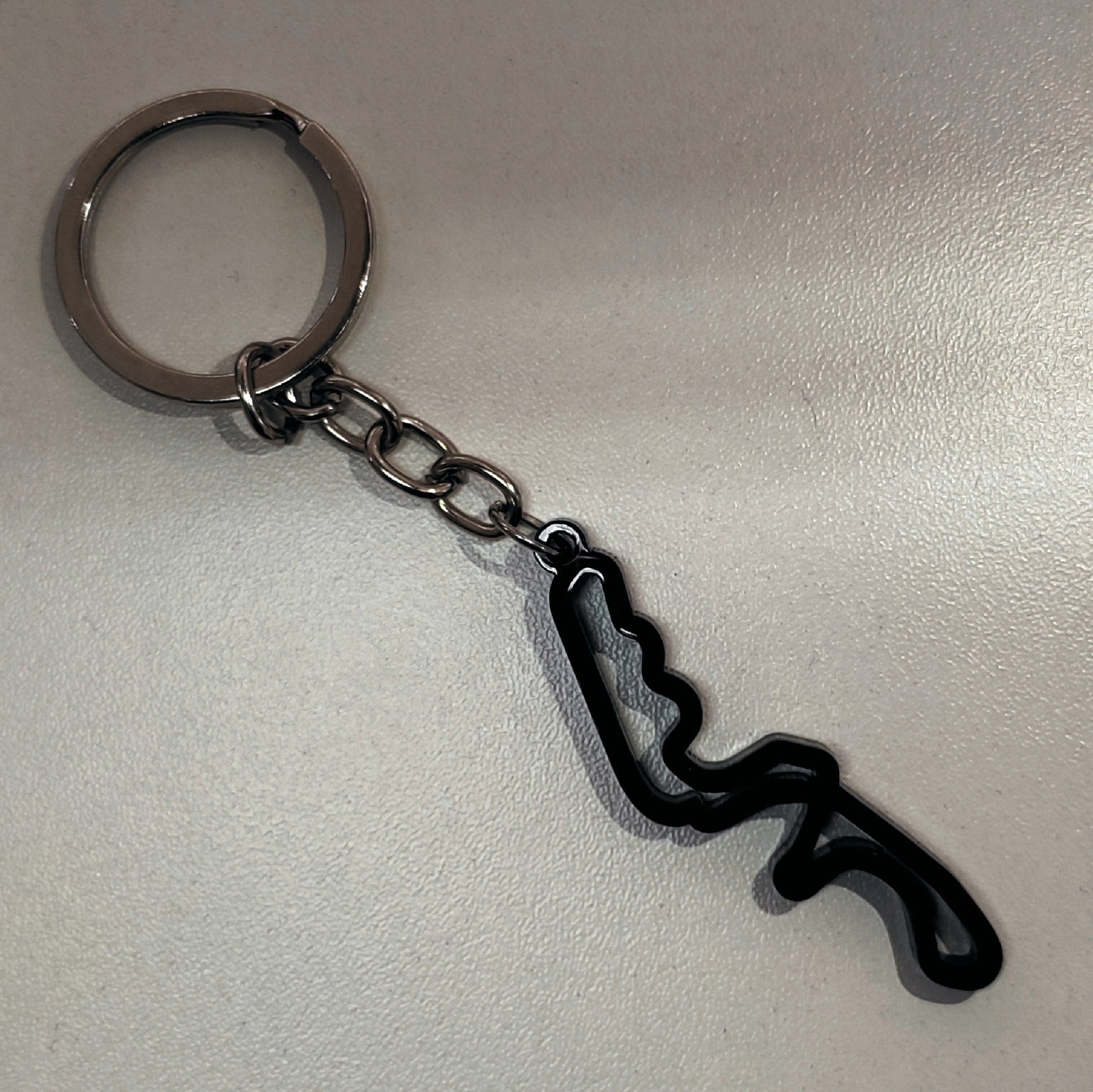 Design: Recorte preciso representando o traçado da pista, com furo para encaixe em chaveiro ou mosquetão.